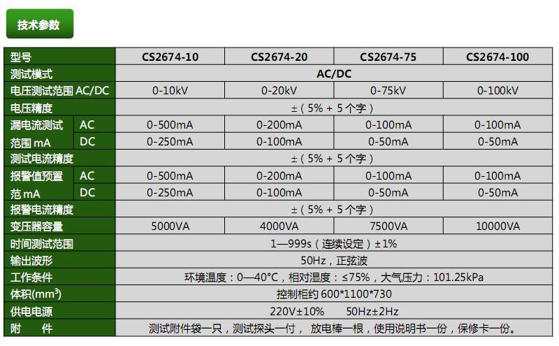 CS2674-10/20/75/100耐壓測(cè)試儀產(chǎn)品參數(shù)