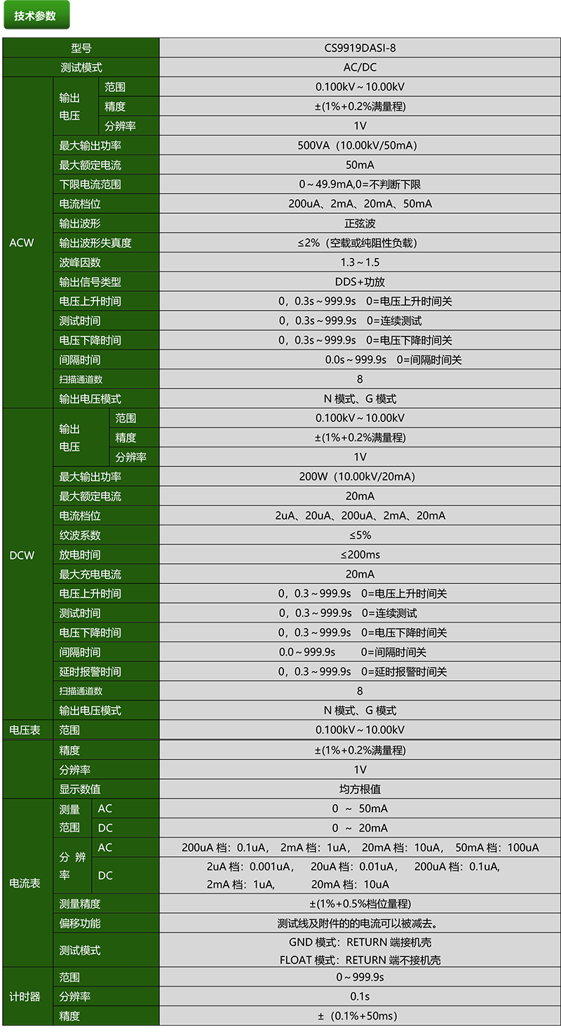CS9919DASI-8程控多路耐壓測試儀產(chǎn)品參數(shù)
