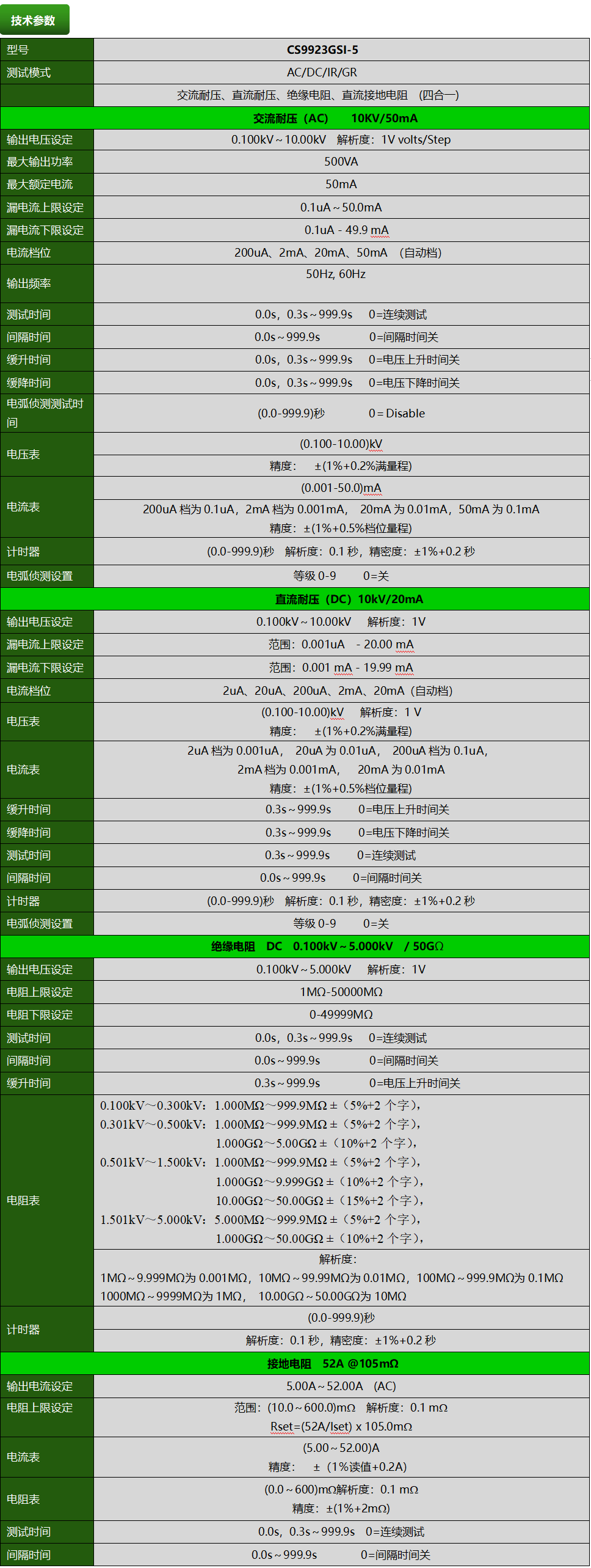 CS9923GSI-5程控光伏組件安規(guī)綜合測(cè)試儀,ACW:10KV/50mA,DCW:10KV/20mA,IR:5KV/50GΩ,GR:52Aac/105mΩ