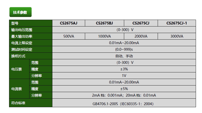 CS2675AJ泄漏電流測(cè)試儀,同系列型號(hào):CS2675BJ,CS267CJ,CS2675CJ-1,電壓0-300V,功率500W-3000W