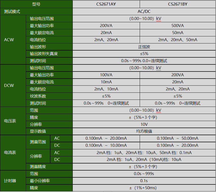同系列產(chǎn)品CS2671BY:ACW:10KV/50mA,DCW:10KV/20mA